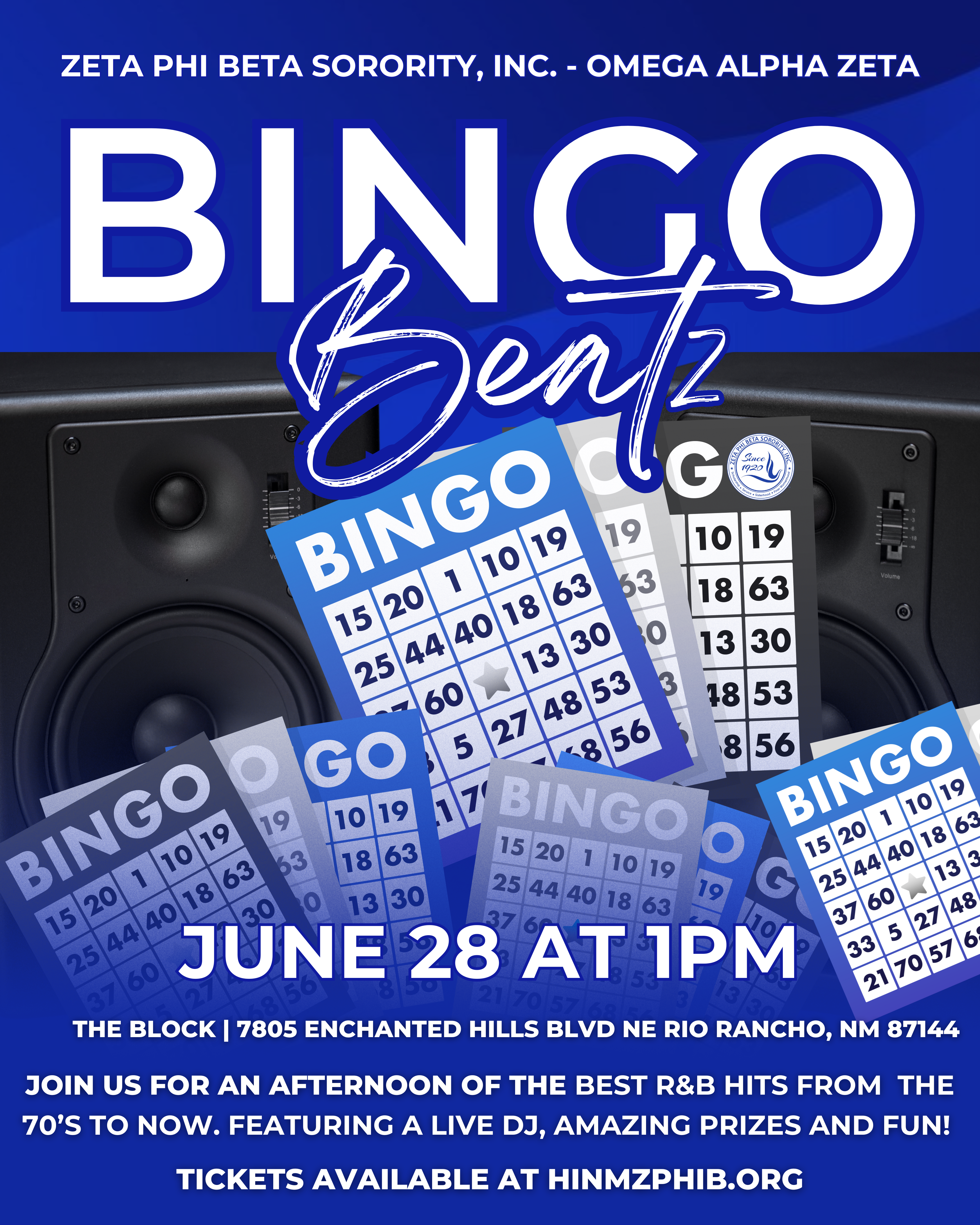Join us for an afternoon of the best R&B hits from the 70’s to now. Featuring a live DJ, amazing prizes and fun! Your $20 entry fee includes 4 Bingo Cards, additonal bingo cards can be purchased for $5.00 each. All proceeds benefit the scholarship and service initiatives of Zeta Phi Beta Sorority, Inc. – Omega Alpha Zeta Chapter.